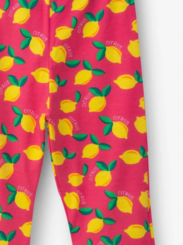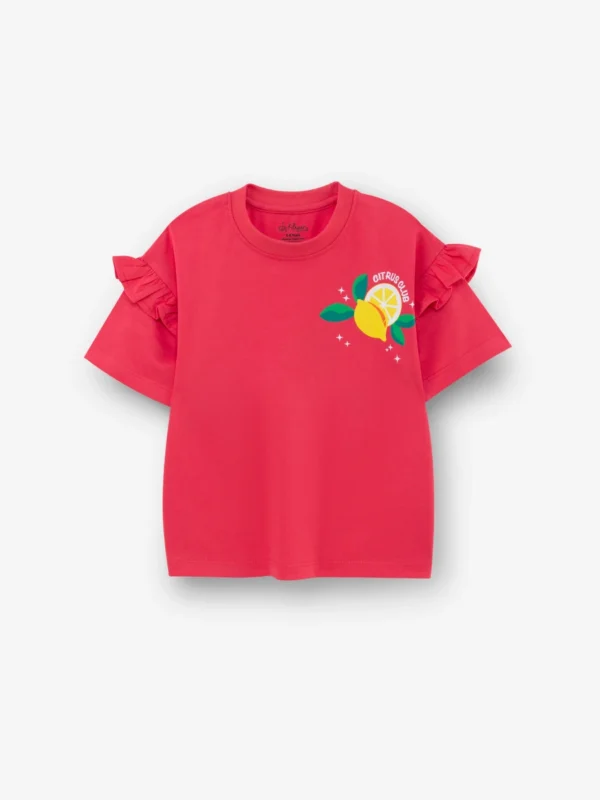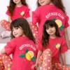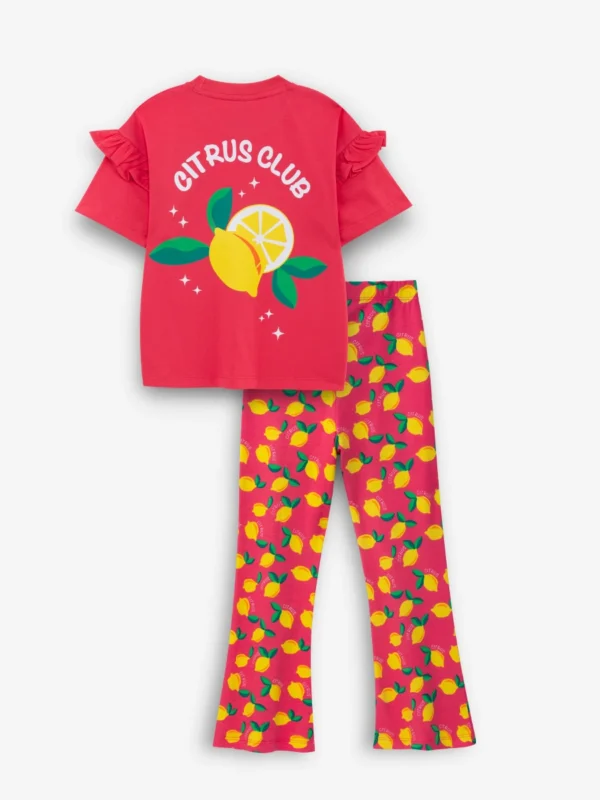 Playful Citrus Print – A vibrant red base with bright lemon motifs that make the outfit lively and stylish.